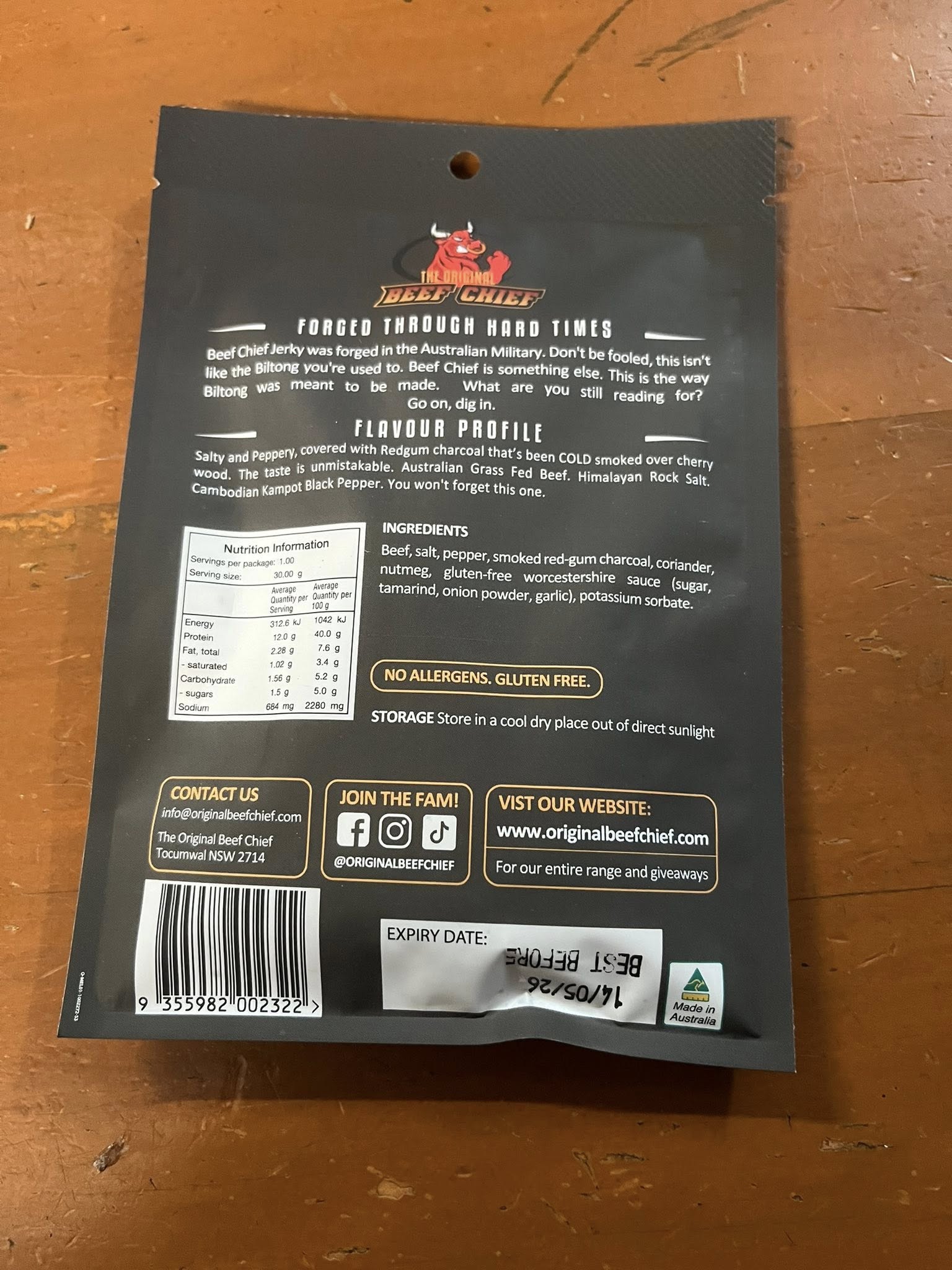 Beef Chief Biltong 30g packet. Gunpowder flavour. Level 2 heat.