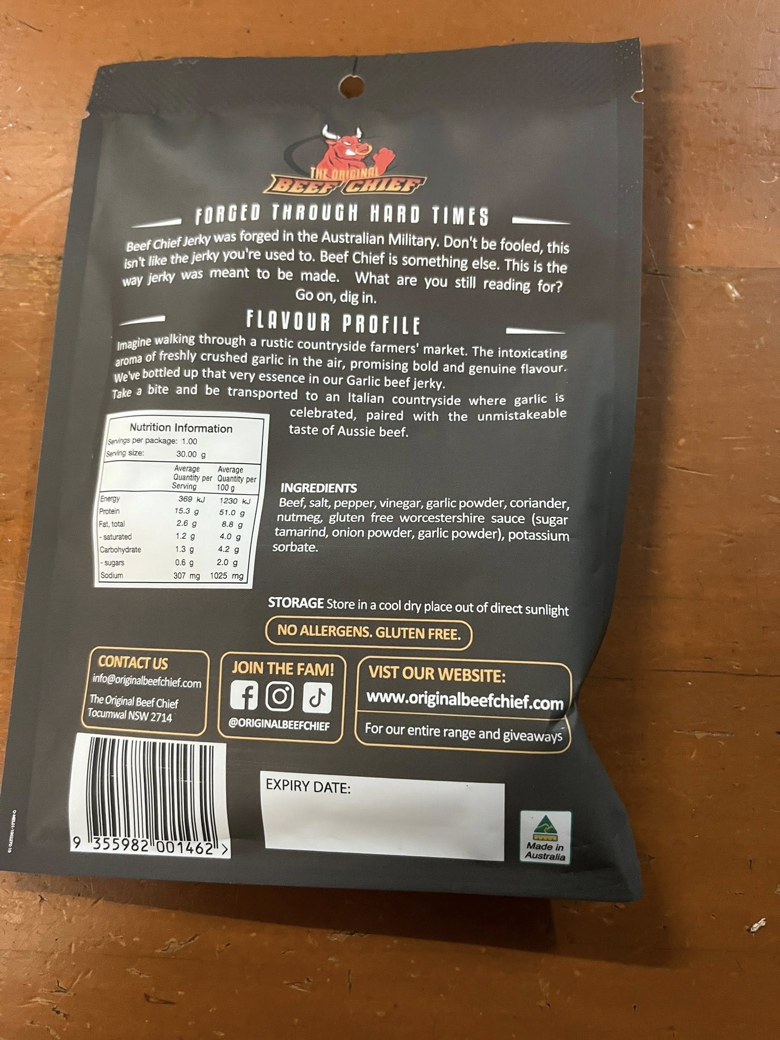 Beef Chief Beef Jerky 30g packet. Garlic flavour. Level 1 heat