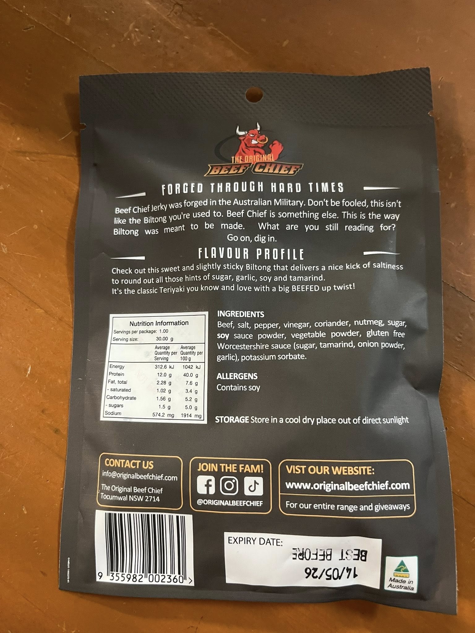 Beef Chief Biltong 30g packet. Teriyaki flavour. Level 1 heat.