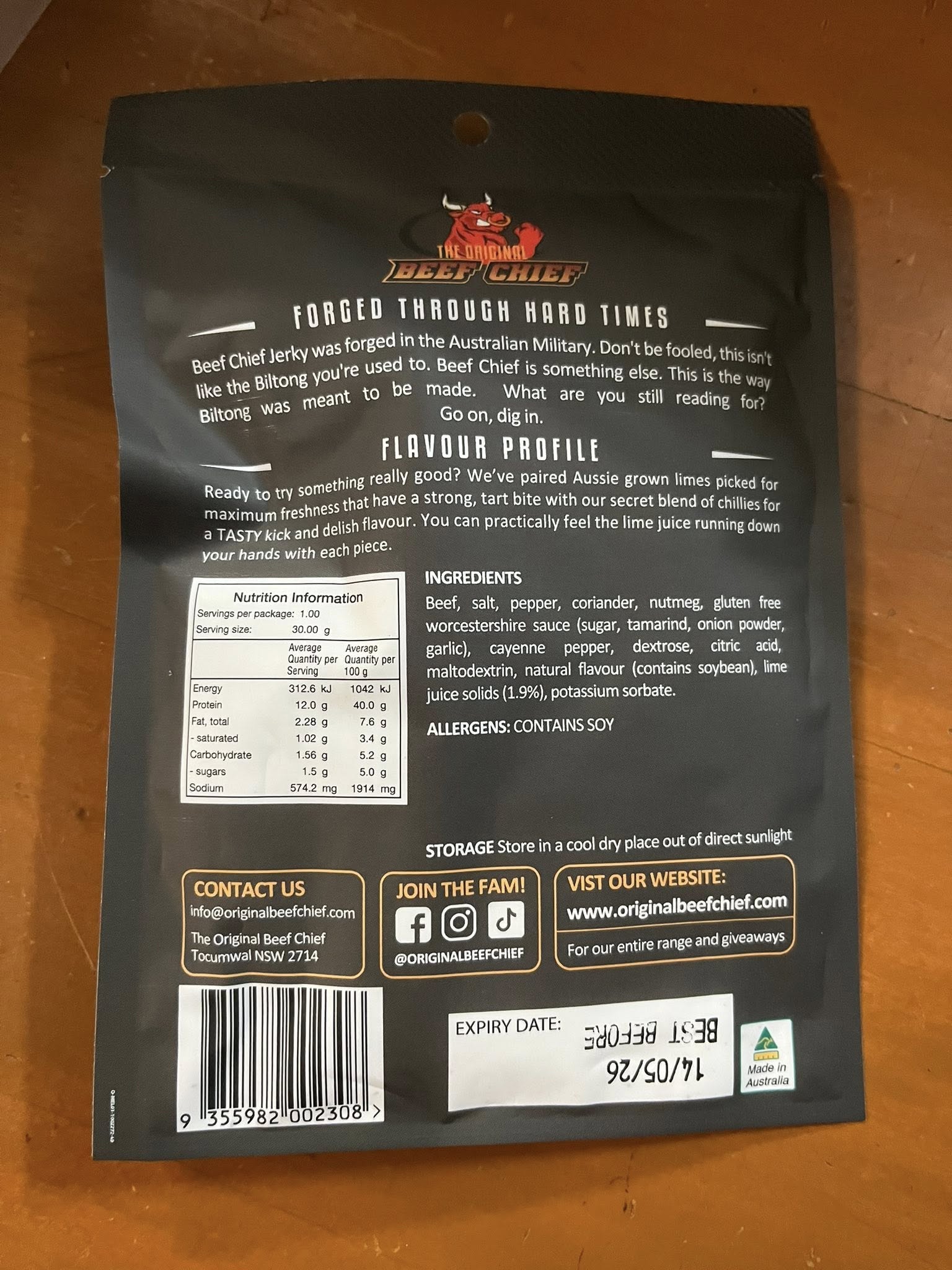 Beef Chief Biltong 30g packet. Chilli lime flavour. Level 4 heat