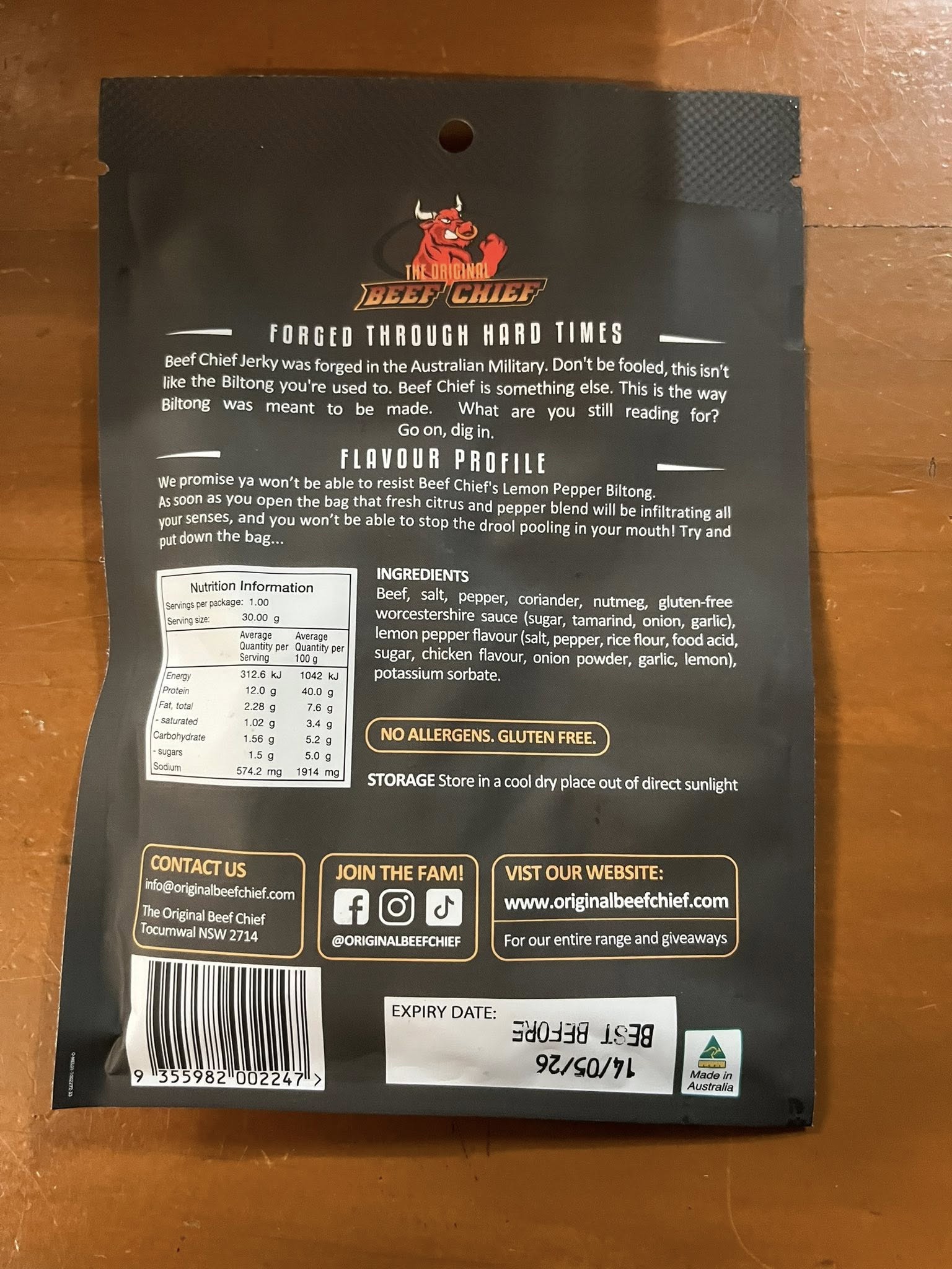 Beef Chief Biltong 30g packet. Lemon Pepper flavour. Level 2 heat.