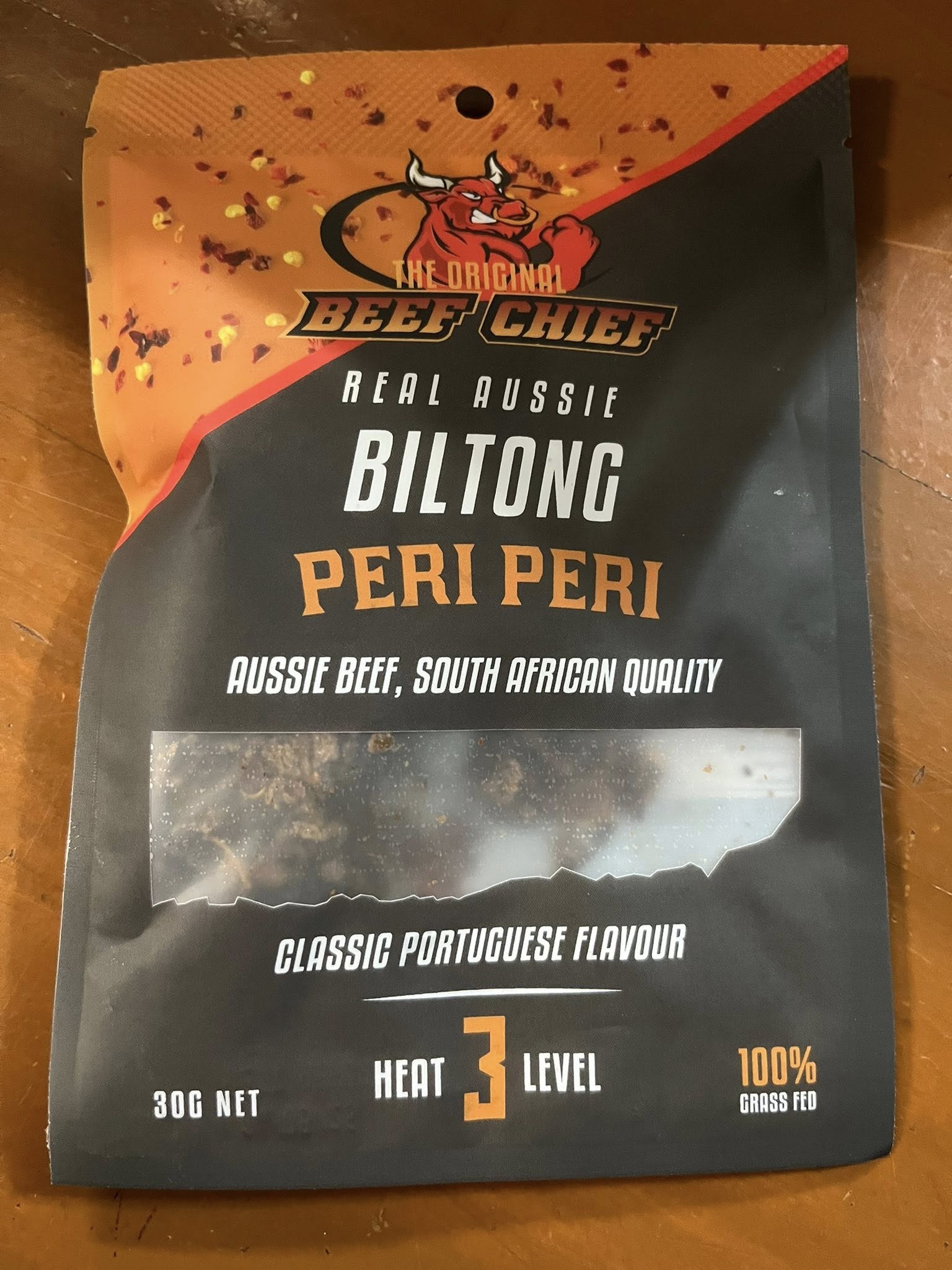 Beef Chief Biltong 30g packet. Peri Peri flavour. Level 3 heat.