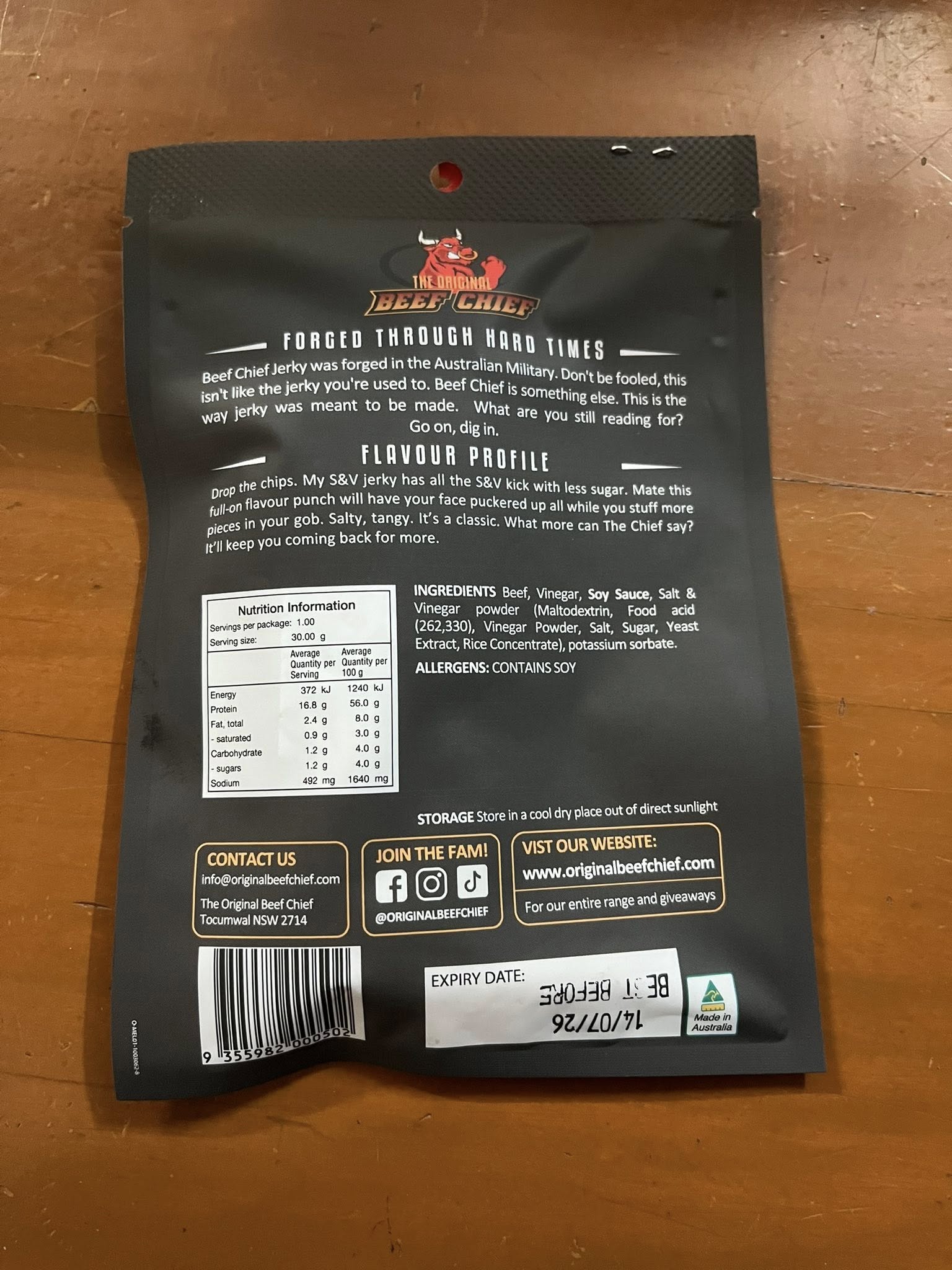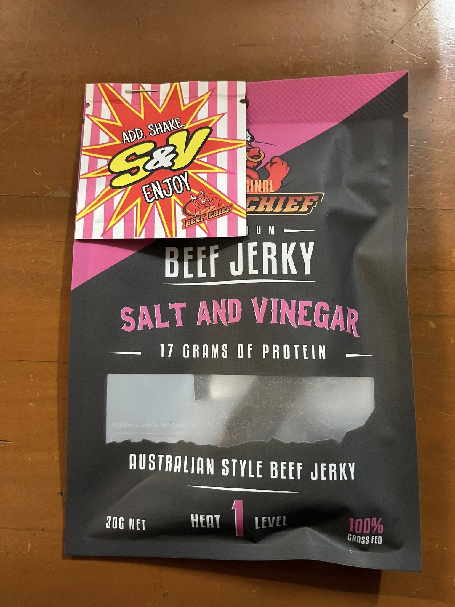 Beef Chief Beef Jerky 30g packet. Salt and Vinegar Jerky flavour. Level 1 heat