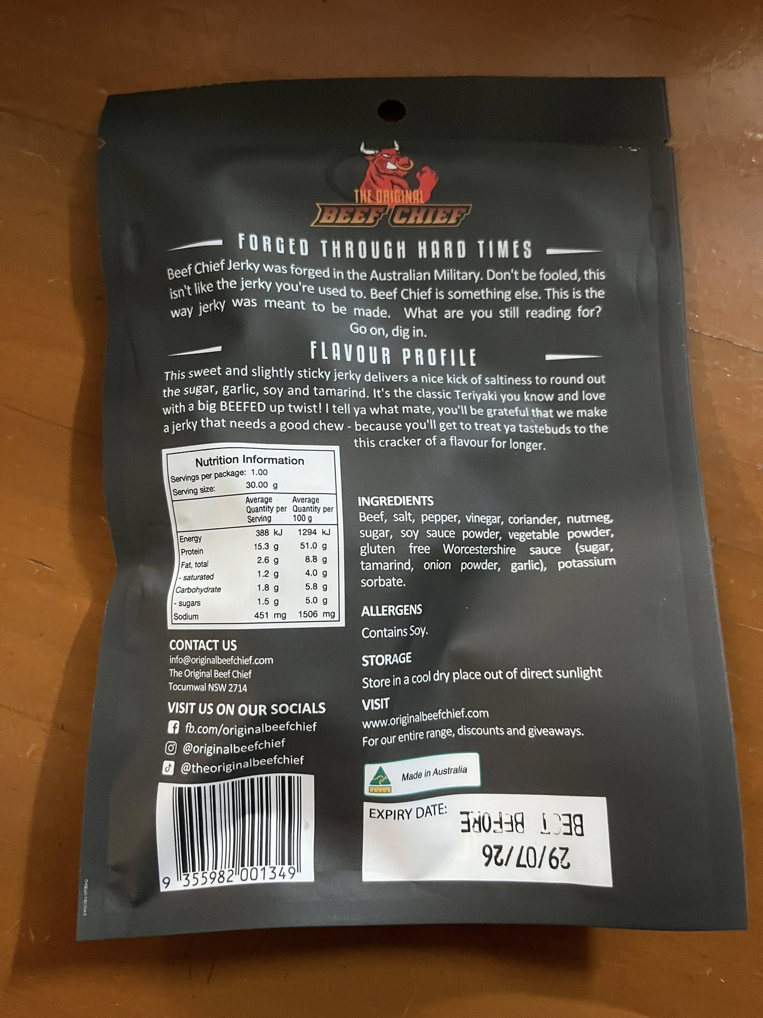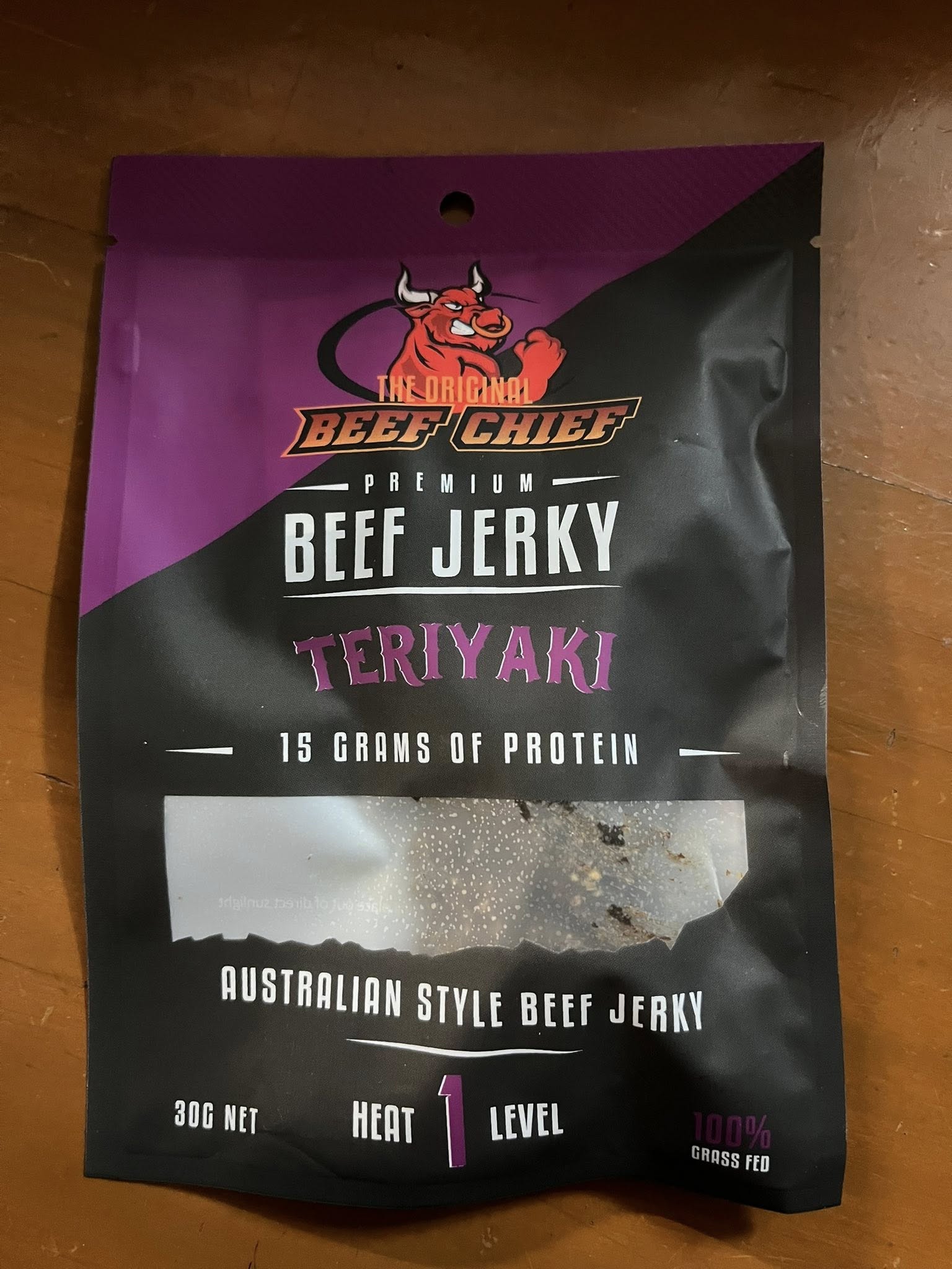 Beef Chief Beef Jerky 30g packet. Teriyaki flavour. Level 1 heat