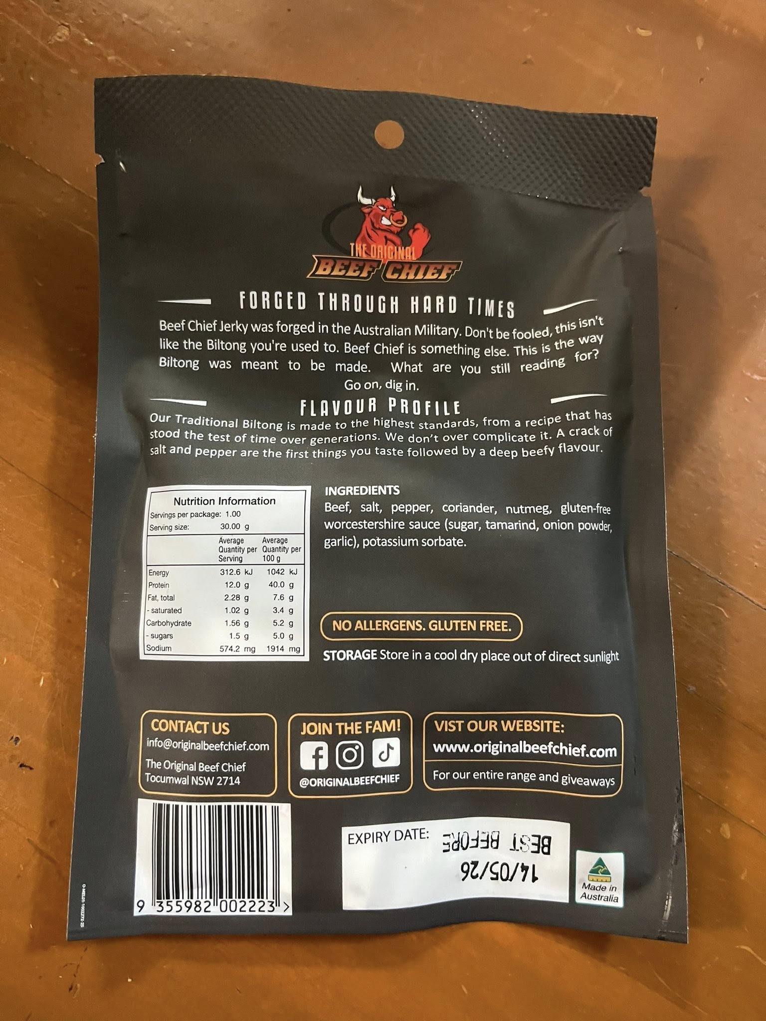Beef Chief Biltong 30g packet. Traditional flavour. Level 1 heat.