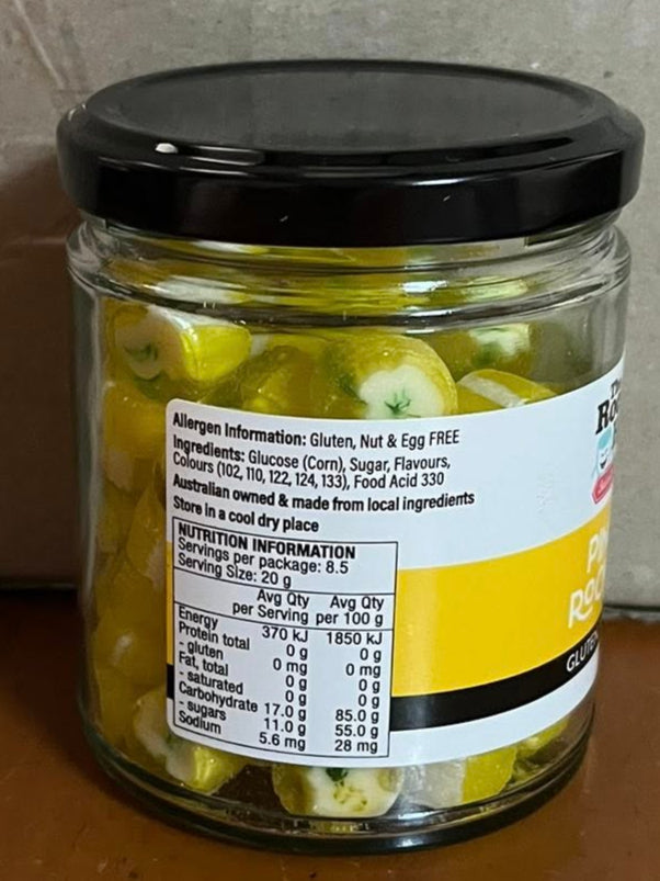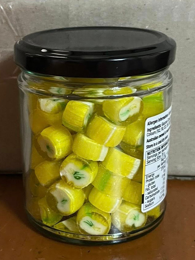 Traditional Pineapple Rocks. They are a round pineapple rock candy. Comes in a glass jar.