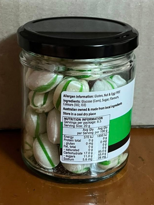 Traditional Choc Mint Humbugs. They are a mint humbug with a chocolate centre. Comes in a glass jar.