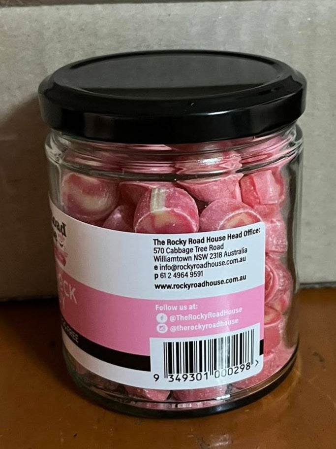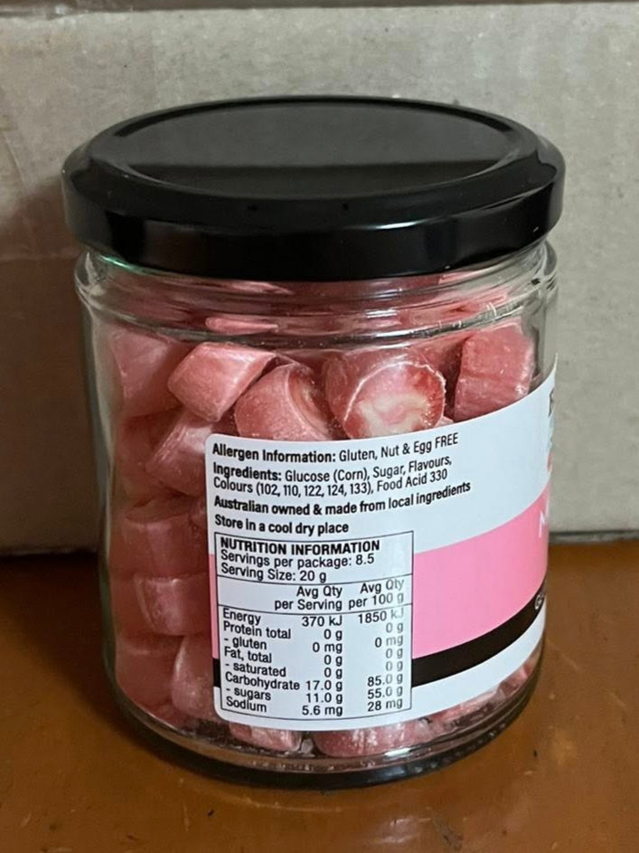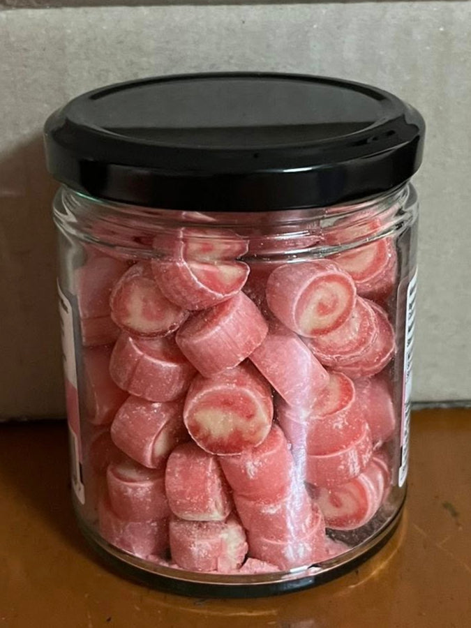 Traditional Musk Rock Candy. They are round rock candy with a musk flavour Comes in a glass jar.
